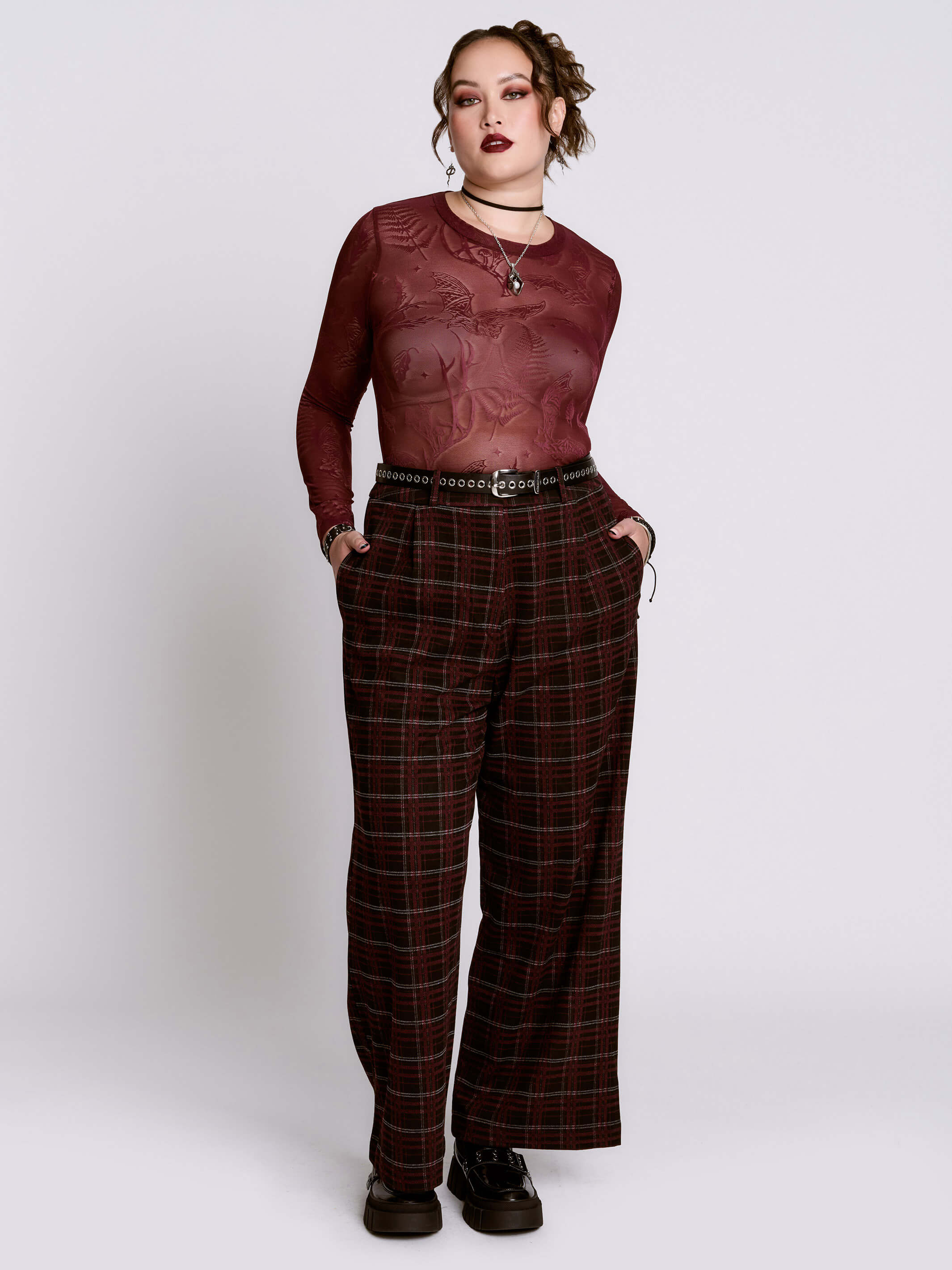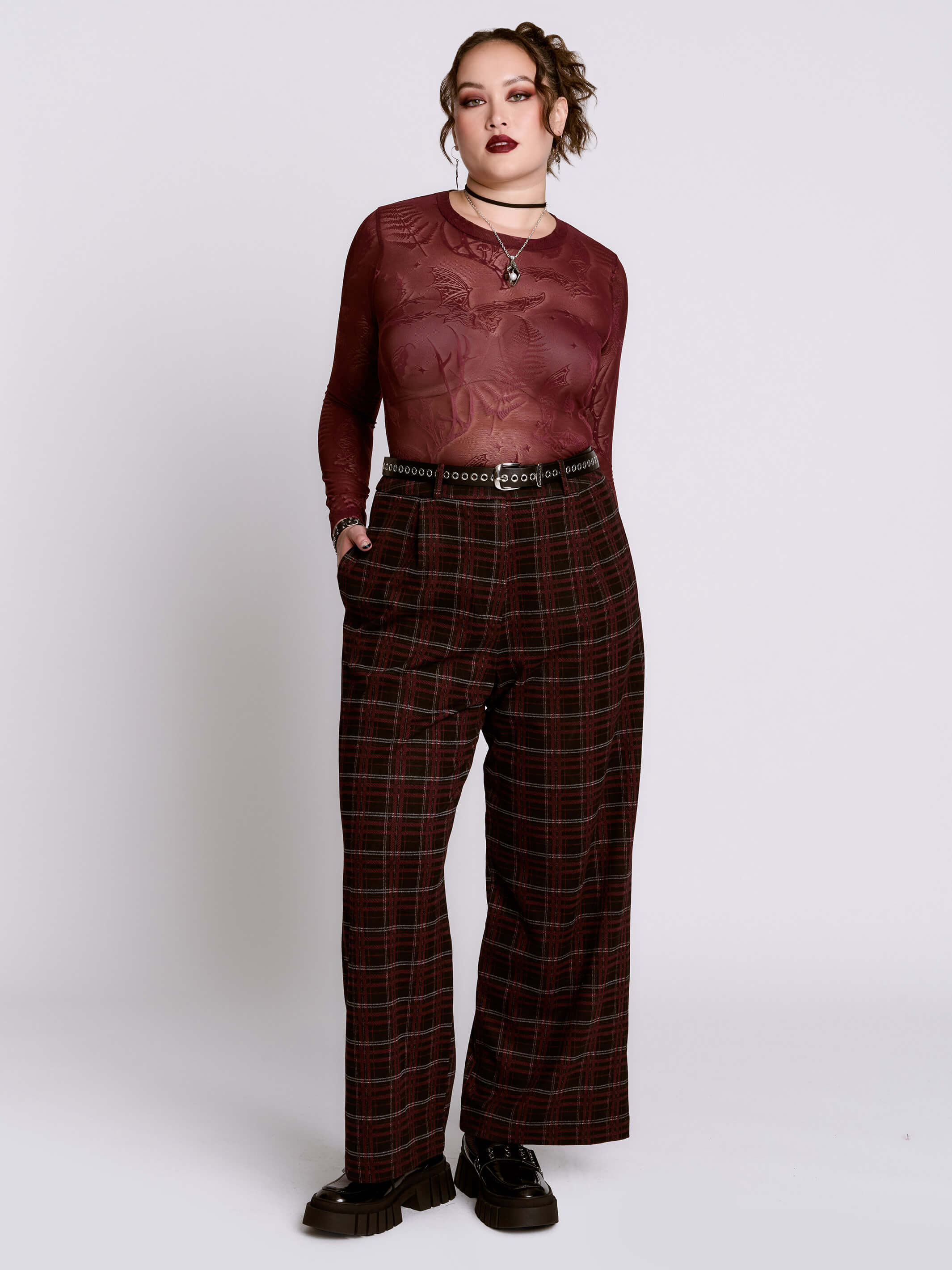 Styled with our Spellbound BootsOxblood Bat Mesh Top, and Grommet Belt (sold separately)