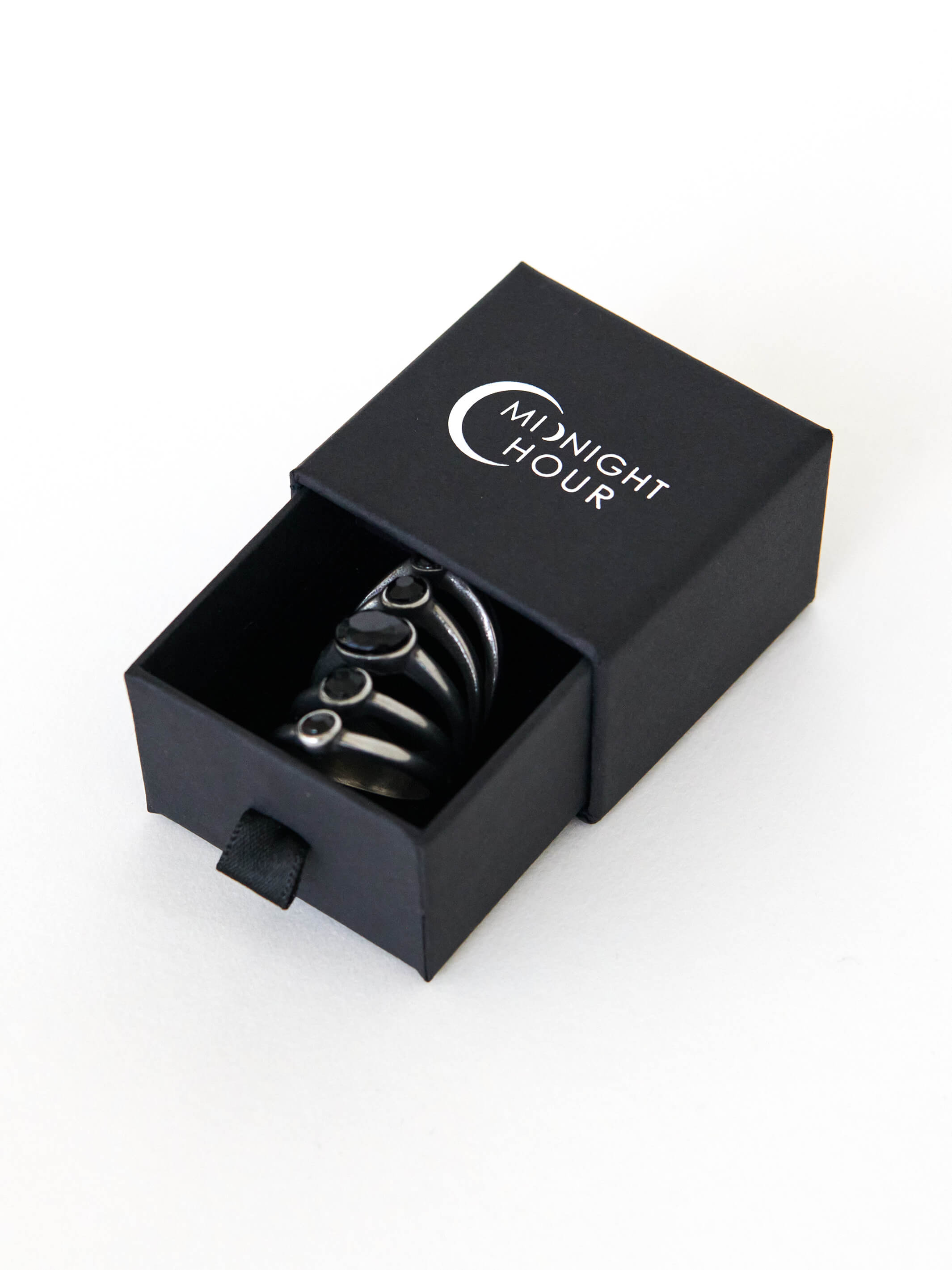 This is our custom designed ring with black stones inset on stainless steel. Size 8 & can be worn on any finger it fits! Comes with gift box. Jewelry items are final sale.