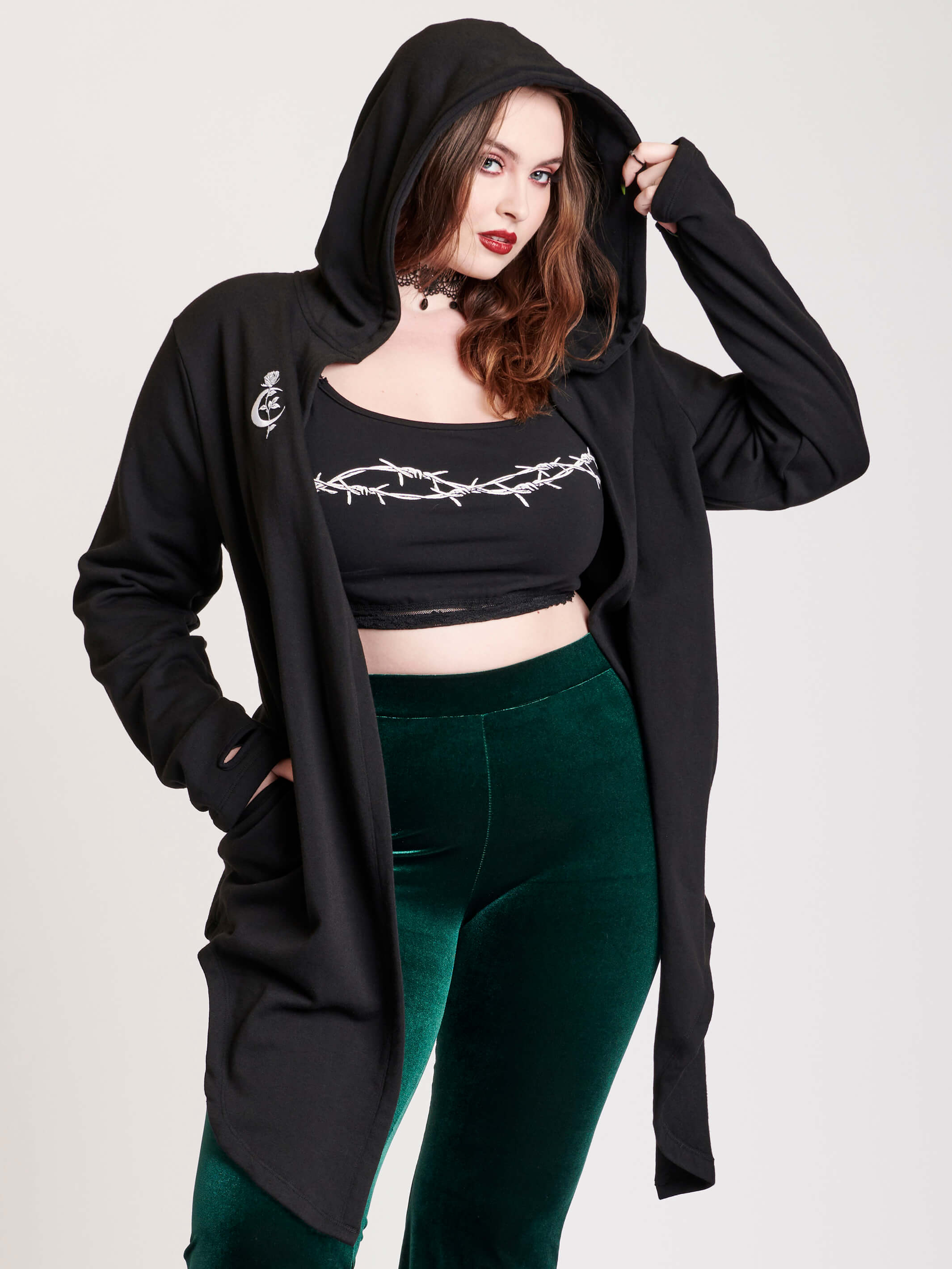 Tap into some voodoo vibes with this embroidered spinal back detail on our french terry hooded cloak. Crescent moon & rose embroidery on the front. Asymmetrical hem with pockets. 56% cotton, 44% polyester french terry. Oversized Unisex (men's) sizing. We recommend to go down a size.